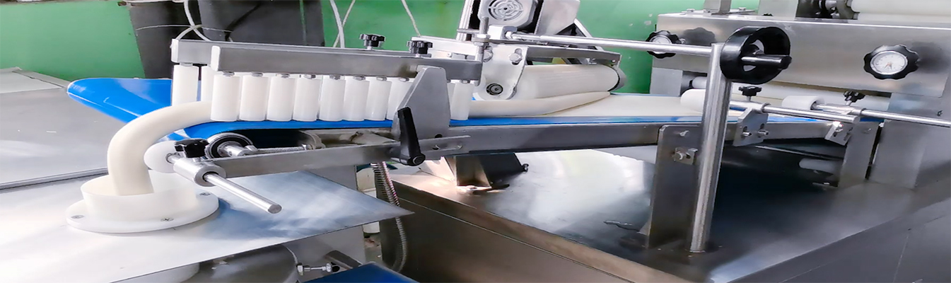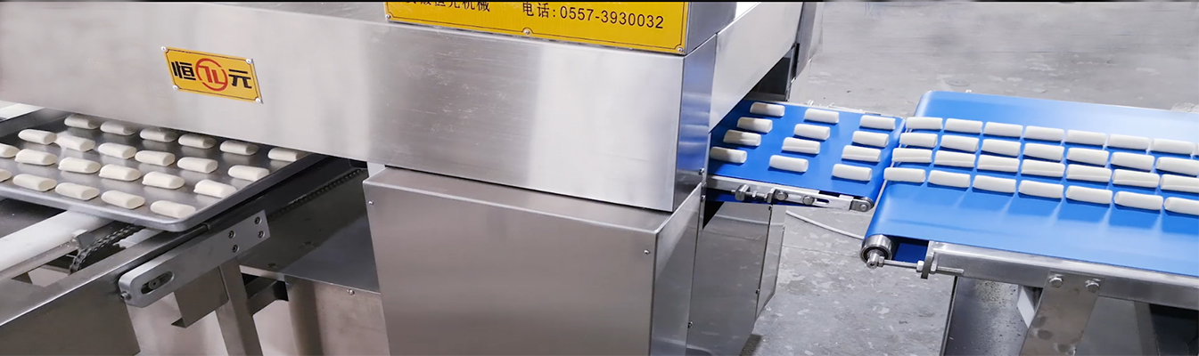 面皮經(jīng)過兩道壓面輪及撐面裝置之輾壓延展,使面皮更有光澤、品質(zhì)更加穩(wěn)定:每道壓面輪皆有厚薄調(diào)整裝置來設(shè)定面皮之厚度以增加或減少產(chǎn)品之重量;面皮在主機輸送帶上,由自動開花器對面皮進(jìn)行條狀、網(wǎng)狀等開花;面皮再經(jīng)由 卷輪及輔助卷輪將面皮卷成條狀;卷面的過程中可以加餡;若欲生產(chǎn)切塊產(chǎn)品,可打開切臺電源,并設(shè)定其切斷長度以決定產(chǎn)品之長度尺寸及重量大??;具同步調(diào)速功能,操作更加方便;成型機可做加餡漢堡、酥餅等;生產(chǎn)出的成品加上自動排盤機,操作更加方便。主要用于生產(chǎn)各類面包、漢堡、酥餅,如法式小面包、法式軟面包、毛毛蟲面包、龍蝦卷面包、蜂巢面包、拉絲面包、長棍面包、夾餡切塊面包、夾心漢堡、瑞士卷等。